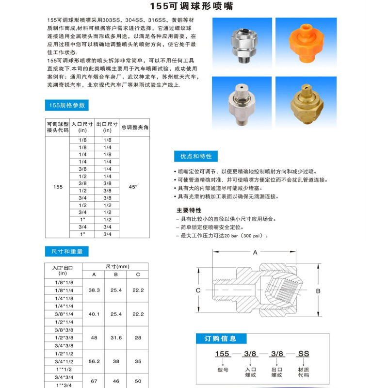不銹鋼可調球噴嘴,它通過螺紋球連接通用金屬噴頭而形成多系列用途,以滿足各種應用需要,在用的過程中您可以精確地調整噴頭的噴射方向,使它處于最佳的工作狀態(tài)??烧{節(jié)噴嘴最大承受壓力為21巴,入口連接尺寸有1/81/4 3/8 和1/2英寸等,材料可選:不銹鋼 黃銅