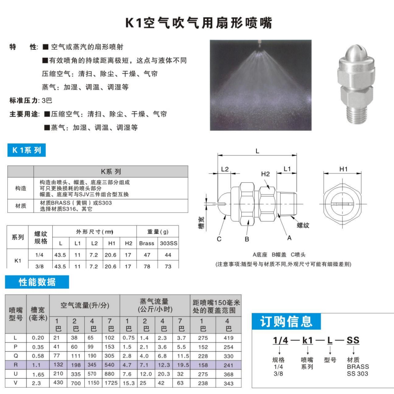 特性:空氣或蒸汽的噴射 有效噴角的持續(xù)距離極短,這點(diǎn)與液體不同 壓縮空氣:清掃、除塵、干燥、氣簾 蒸氣:加濕、調(diào)溫、調(diào)濕 構(gòu)造 構(gòu)造由噴頭、帽蓋、底座三部份組成可只更換損耗的噴