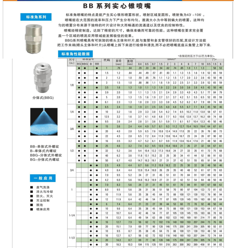 使用時(shí)產(chǎn)生實(shí)心錐形噴霧形狀,噴霧區(qū)域成圓形,噴霧角度為43-120度。 2、能在大范圍流量和壓力下產(chǎn)生分布均勻、液滴大小為中等到偏大的噴霧,葉片設(shè)計(jì)是其設(shè)計(jì)機(jī)理,并大而暢通的通道和先進(jìn)的噴流控制。 3、該噴嘴對(duì)于要求完全覆蓋一個(gè)區(qū)域的噴流應(yīng)用領(lǐng)域能發(fā)揮極佳的效果。 4、 BB系列金屬?lài)娮鞛橥饴菁y接頭,B系列金屬?lài)娮鞛閮?nèi)螺紋接頭。