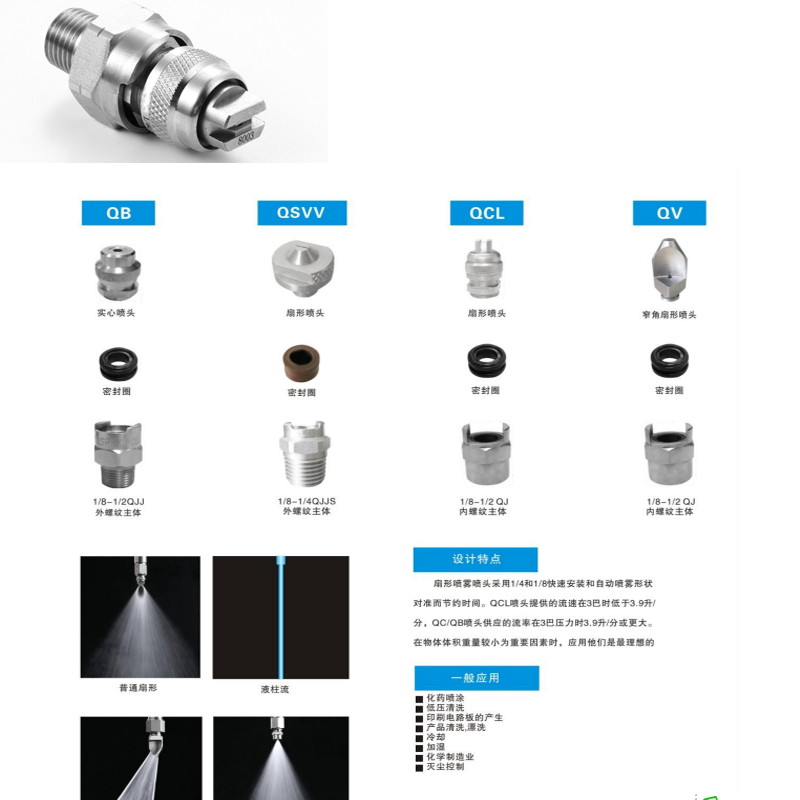 扇形噴霧噴頭采用1/4和1/8快速安裝和自動噴霧形狀對準而節(jié)約時間,QCL噴頭提供的流速在3巴時低于3.9升/分 ,QC/QB噴頭供應的流率在3巴壓力時3.9升/分或更大。在物體體積重量較小為重要因素時