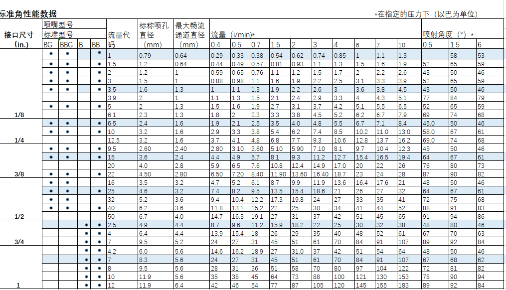 使用時產(chǎn)生實心錐形噴霧形狀,噴霧區(qū)域成圓形,噴霧角度為43-120度。 2、能在大范圍流量和壓力下產(chǎn)生分布均勻、液滴大小為中等到偏大的噴霧,葉片設(shè)計是其設(shè)計機(jī)理,并大而暢通的通道和先進(jìn)的噴流控制。 3、該噴嘴對于要求完全覆蓋一個區(qū)域的噴流應(yīng)用領(lǐng)域能發(fā)揮較好的效果。 4、 BB系列金屬噴嘴為外螺紋接頭,B系列金屬噴嘴為內(nèi)螺紋接頭