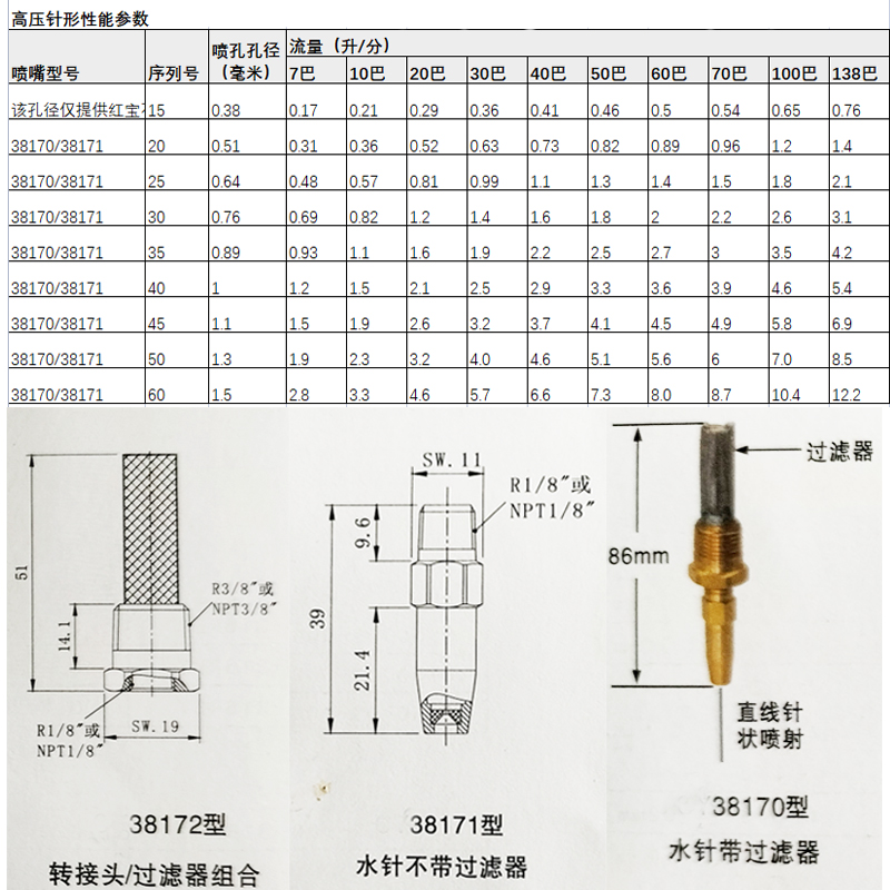 38170噴嘴主體為黃鋼材質(zhì) ,過濾網(wǎng)為不銹鋼材質(zhì),噴孔處鑲件材質(zhì)是陶瓷、紅寶石或著 不銹鋼